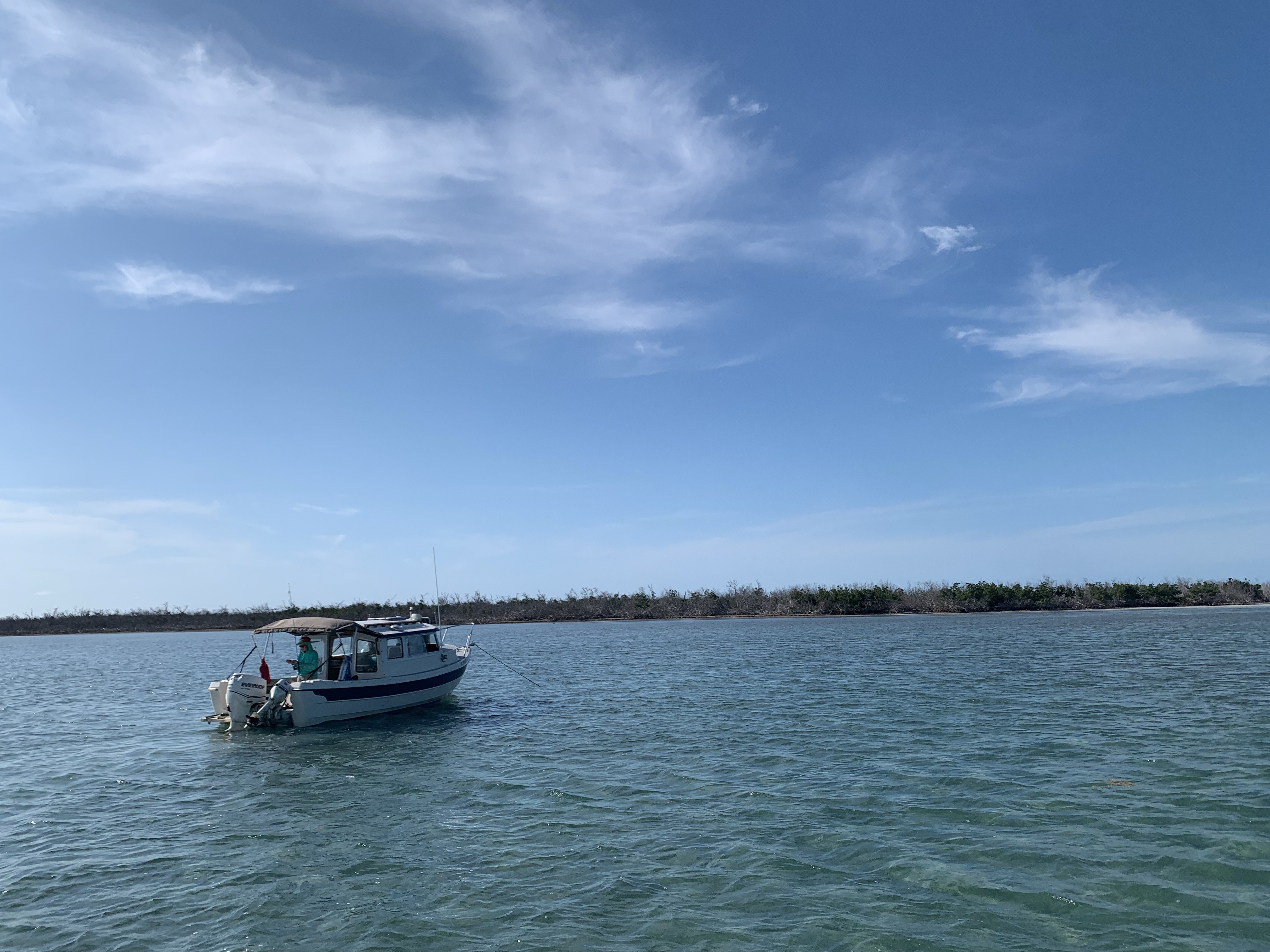 Woke up to a rough anchorage, but in the best location possible given the conditions. We took our time this morning and actually made coffee and breakfast. Unfortunately the wind continued to pick up, making it impossible to get to our next planned spot even further northeast. We swam ashore pulling the SUP behind us. There was a nice channel that looked like a spring run and had a distinctly colder temperature to it, making us think we were hot on the trail of a nice cave spring. We took the right turn first, and about 1/2 mile into the mangroves we had to take to swimming to get any further. We saw tons of fish, a few sea turtles, puffer fish and at one pint there was even a large tarpon that ended up in my lap as it attempted to evade me. It was quite the day. No caves to be seen. We returned and then went up the other turn as far as we could, finding much of the same. On the way back we stopped along the low tide shoreline and went for a mile run, finding some cool old bottles along the way. We also explored the ruins of an old lighthouse tower, and I found a really cool old bottle that was square in shape and said “Dr. J. Hofstetter’s Stomach Bitters”. We returned to the boat, now sitting in low tide at 1.9’ and doing just fine. Dinner and a movie, Life Aquatic. Windy all evening, there are two other boats taking advantage of this anchorage.