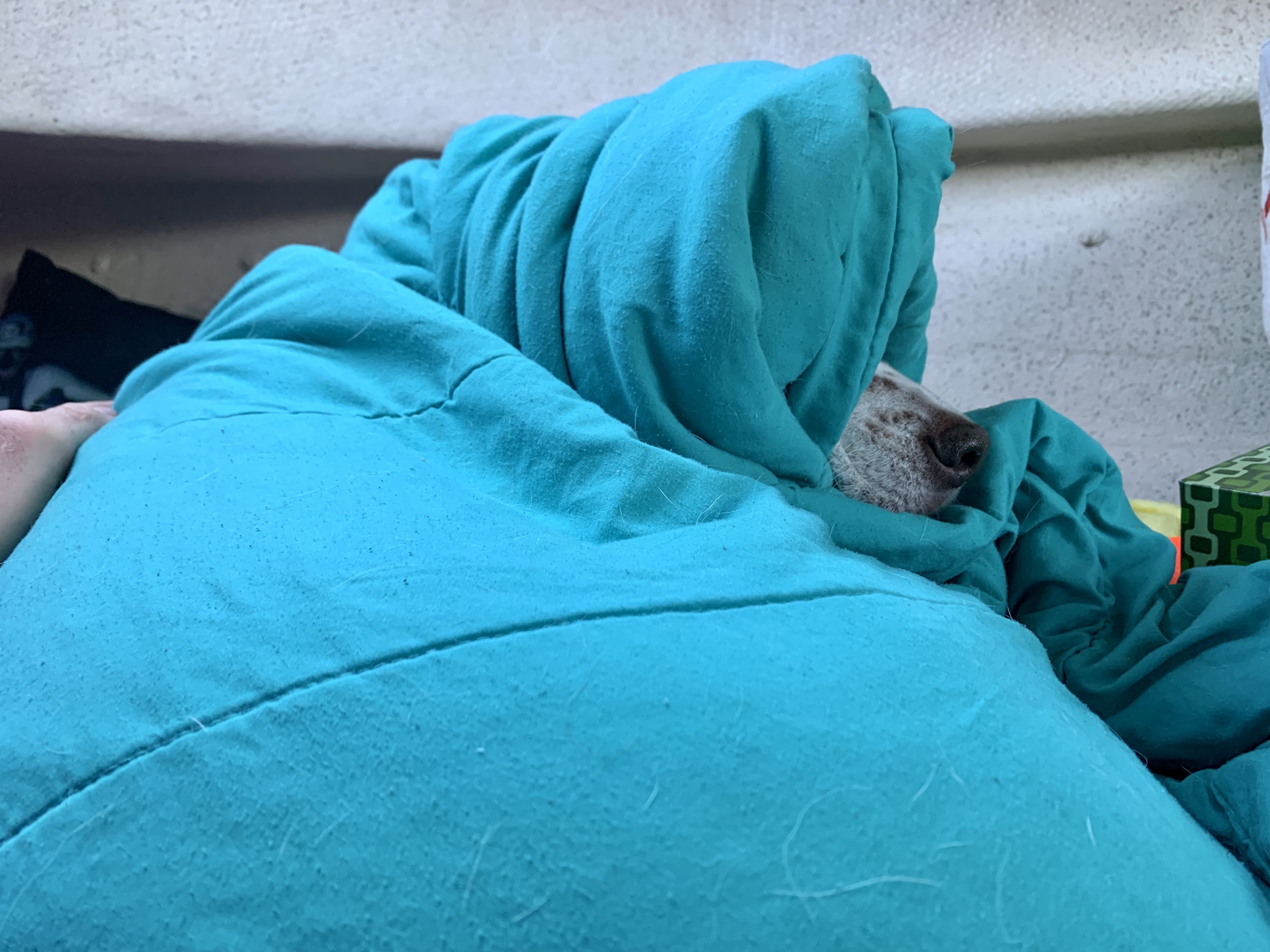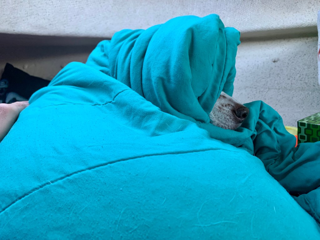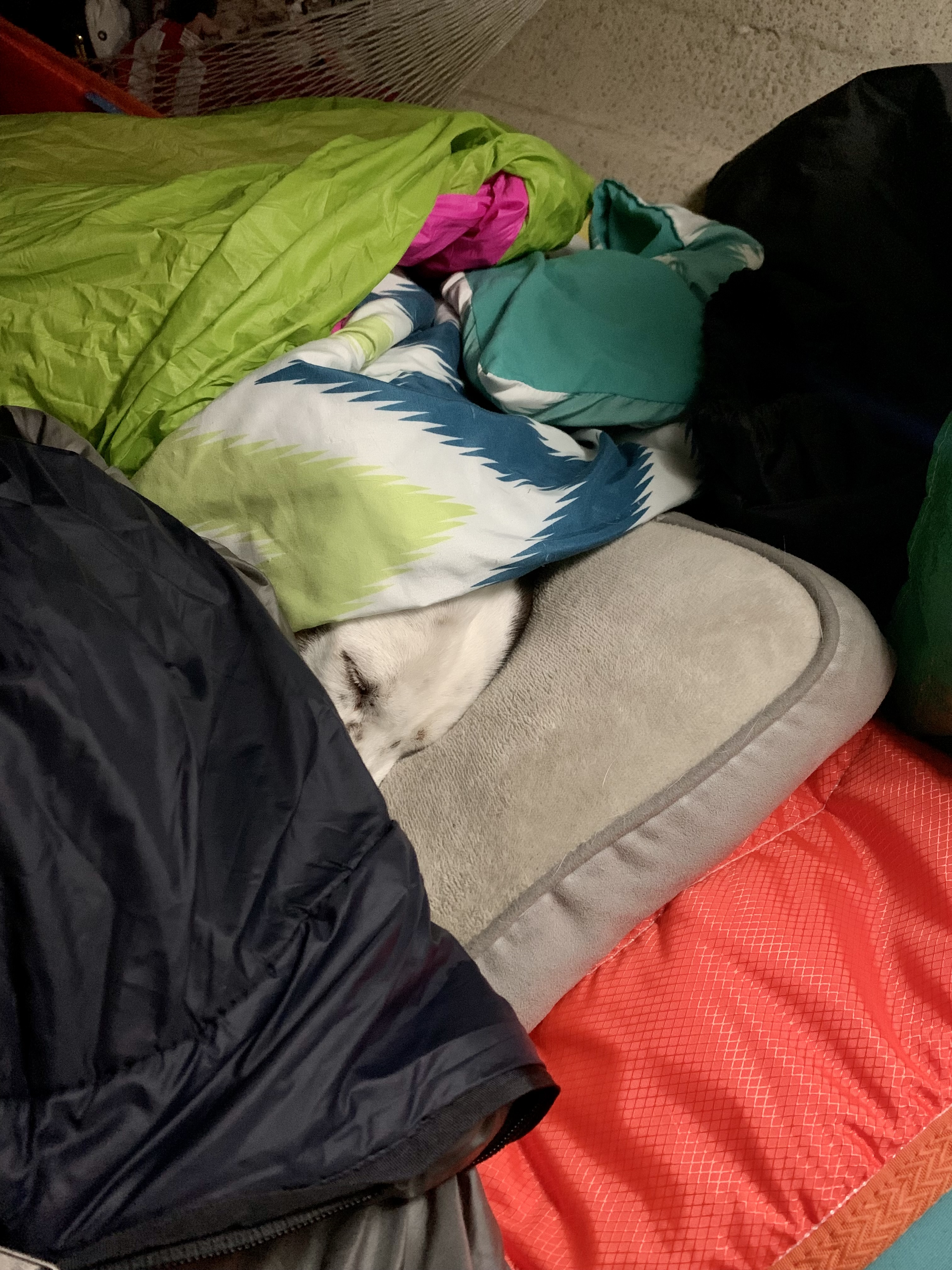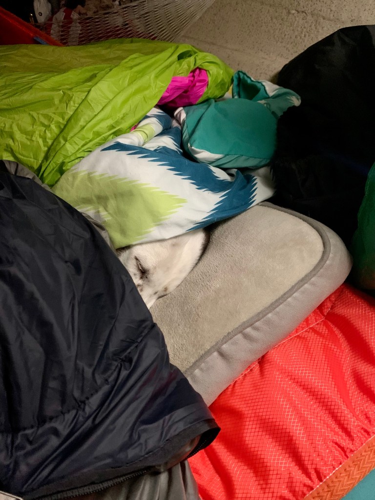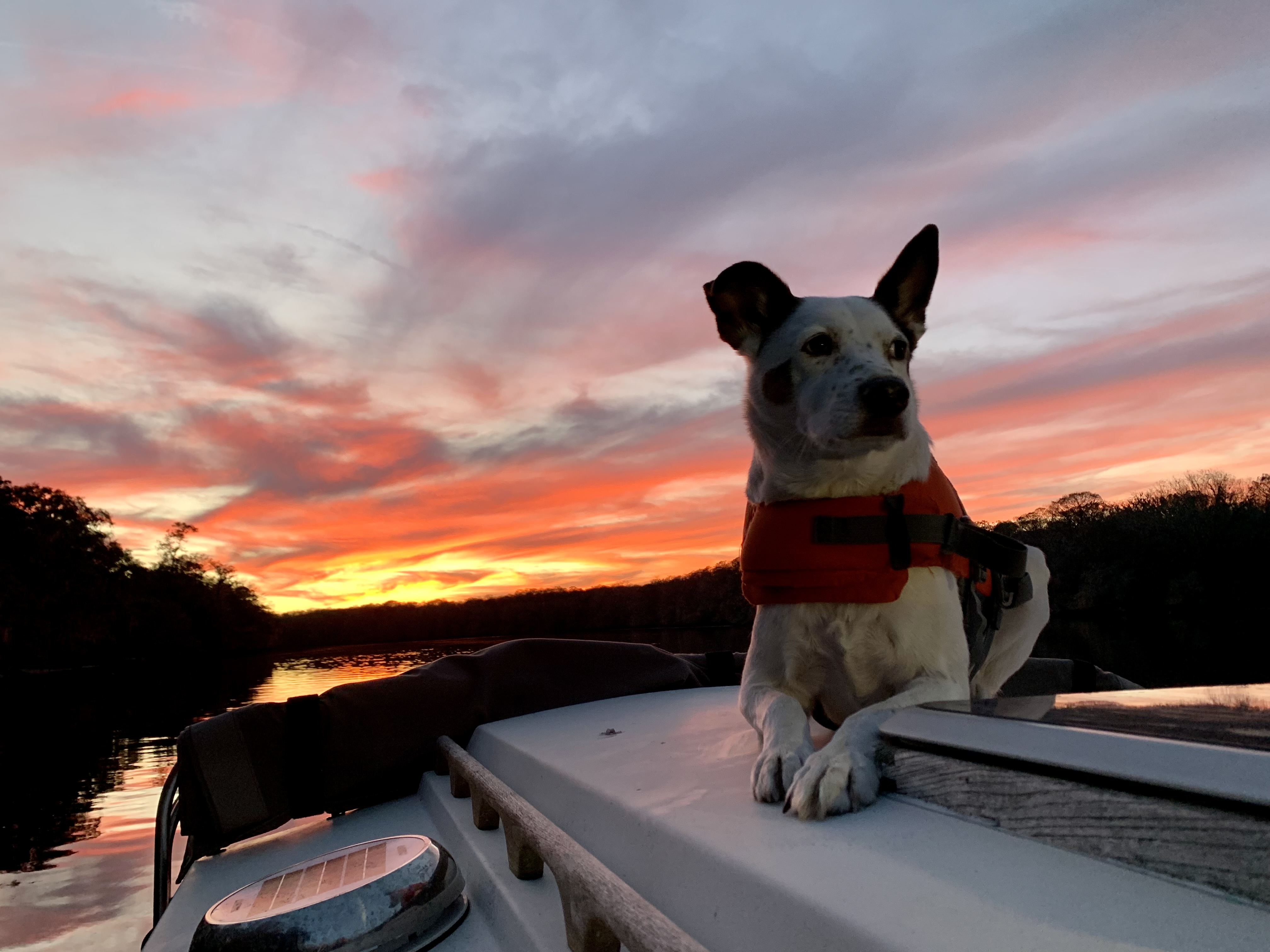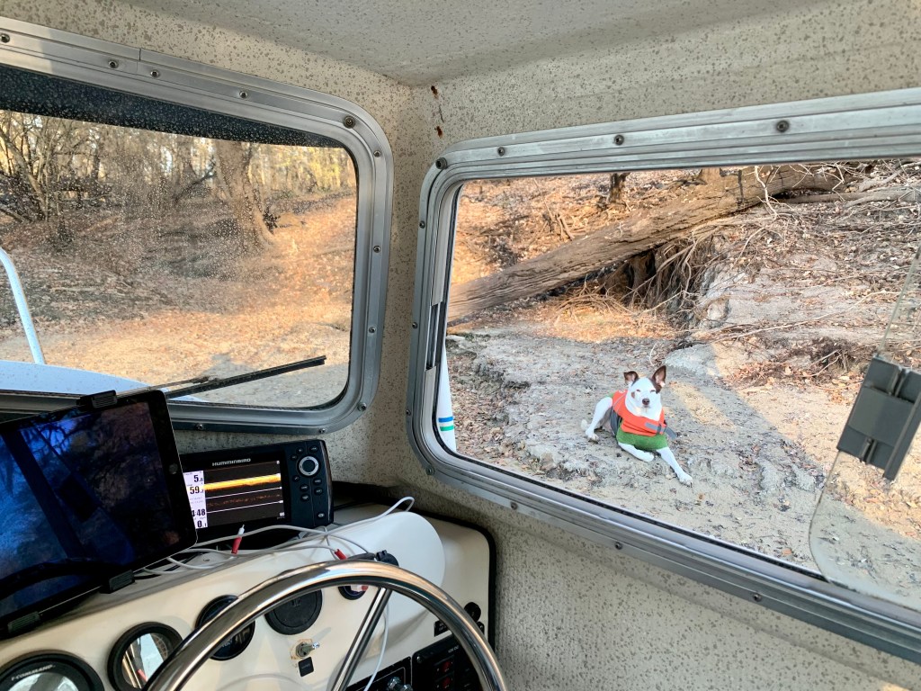 Sheck woke me up around 4am after he heard something outside the boat. I listened and soon heard sticks breaking and then splashing coming from the shoreline 30′ away. I sat up and looked out of the hatch and saw a dog running on shore. My first concern was of where her human might be, but she was alone. We came ashore and she was visibly cold, wet and hungry. We fed her a whole bunch of Sheck’s food and dried her off with a towel. I brought her onto the boat and cuddled her up in some blankets, then set her in front of the heater. Thank goodness she had an ID tag on her collar and I was able to contact the owner, who came to meet me at the launch and pick her up. We pulled the boat out that morning and headed home.