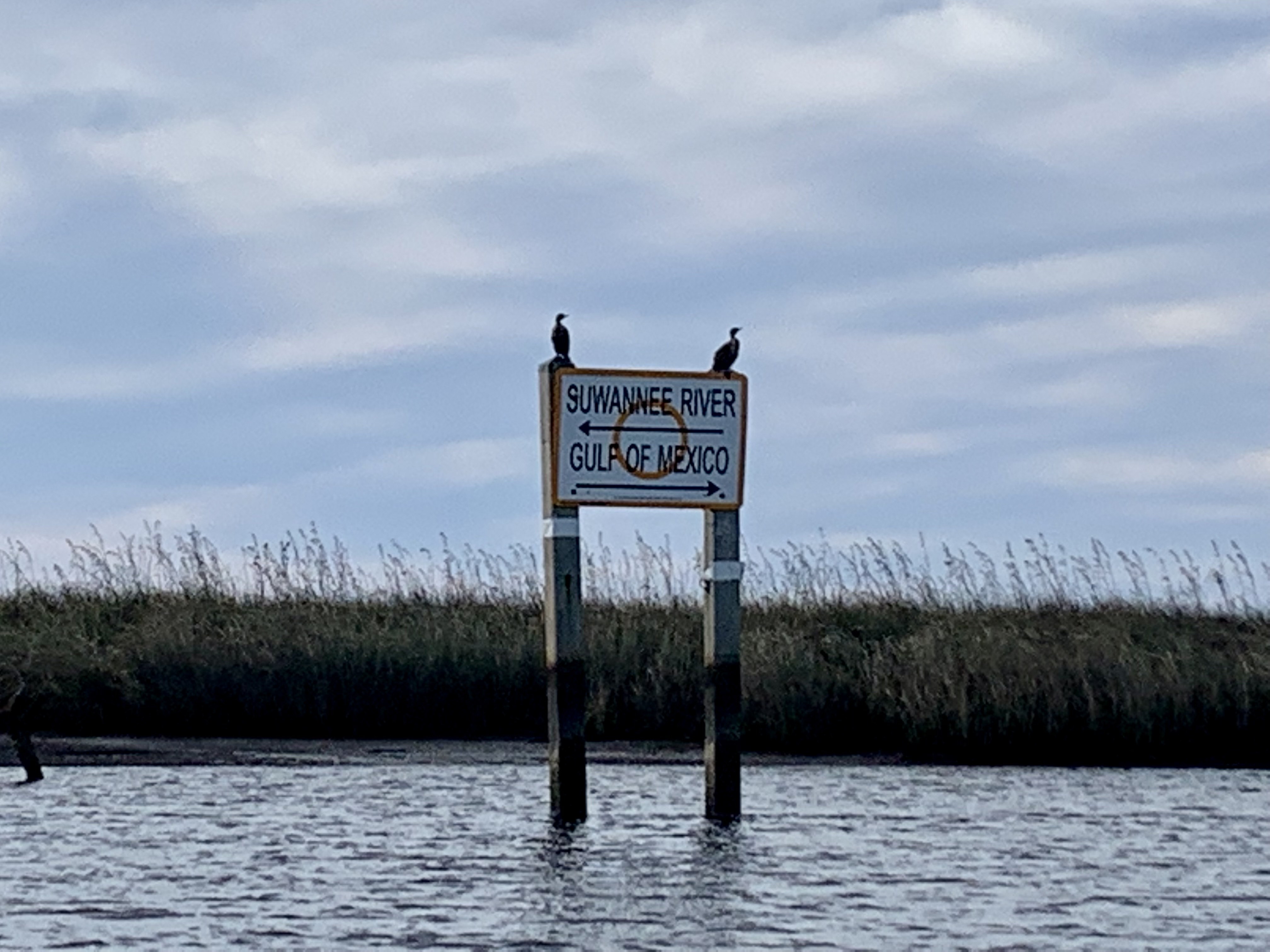 Stayed warm last night but had a lot of condensation in the cabin that froze overnight and melted as the day warmed up. Learned to just sleep with the hatches open for better air flow. I got the boat stuck in sand but was able to get out and push it of quite easily. On the way down we went way up a side creek in the Lower Suwannee National Wildlife Refuge and it was quite beautiful. After reaching the Gulf of Mexico we travelled out into the ocean for a few miles and then circled back. We travelled 51 miles today and came to anchor near the junction of the Suwannee River and the “east pass” near the town of Suwannee.