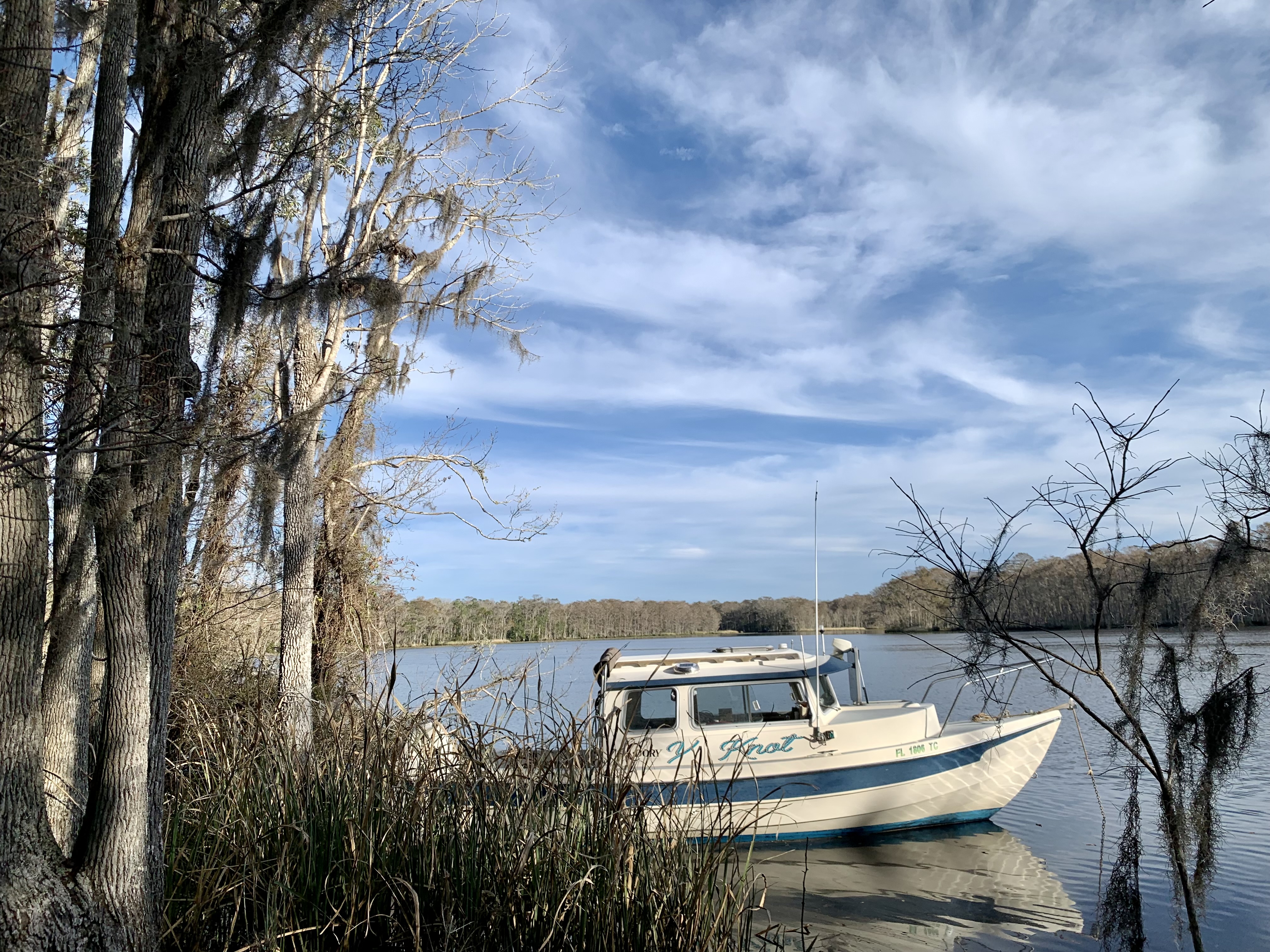 Slept in and hit the water around 0930. On the way upriver we stopped to sonar scan the wreck “City of Hawkinsville”, an old steamship sunken in the river. When we hit the junction where the Santa Fe River dumps into the Suwannee I decided to head upriver a ways. We ended up going all the way to the Ichetucknee River, saw a couple of manatees and came back downriver. We actually went passed Branford on the way back, since I wanted to spend another night on the water. We ended up anchoring near by Little River Spring and settled in for the night. We covered almost 65 miles on this day.