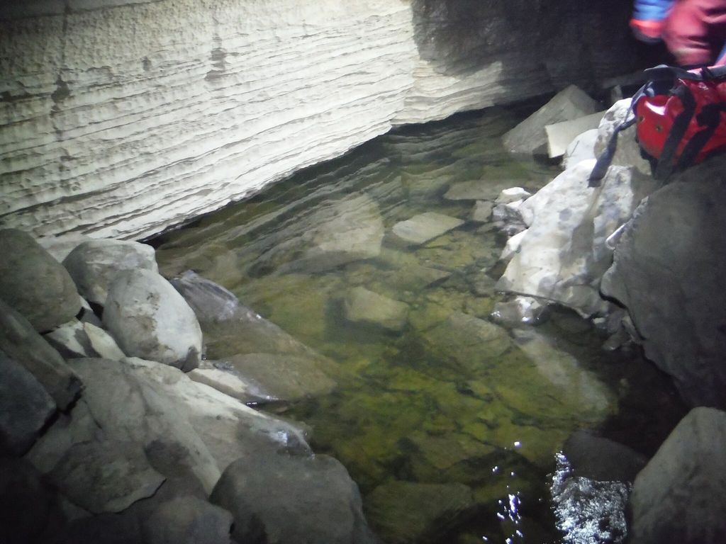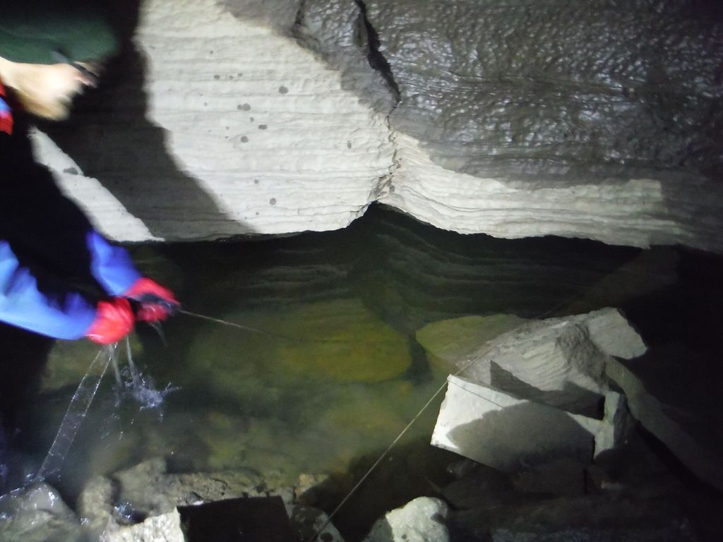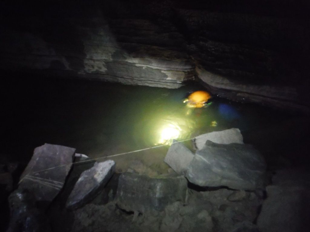 Sump one was uneventful, although I noticed my line (placed 5 months ago) had been buried in a few inches of sand/silt/gravel in some places. Ensuring the line was continuous, I passed the first sump after 6 minutes. I quickly traversed the air chamber and got ready for the next sump.