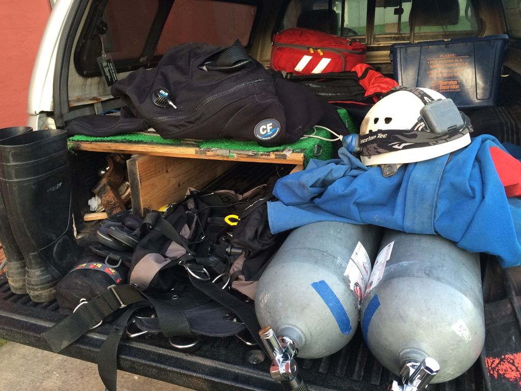For our dive on 6/26/2016, we certainly didn’t have a shortage of sherpas! Assisting with the dive was Nathan Roser, Steve Millett, Thomas Holder, Marlene Holder, Dan Gilroy and Owen Gilroy. We started out in 90 degree heat, hiking the fifteen minutes through the woods to the cave entrance. Steve rigged the drop and the team began moving all of the gear into the cave. For this dive I brought LP95’s, along with two bags full of gear. For exposure protection I am using a DUI CF200 compressed neoprene drysuit. This suit is amazing. It keeps me warm, dry and safe with its phenomenal abrasion resistant neoprene.