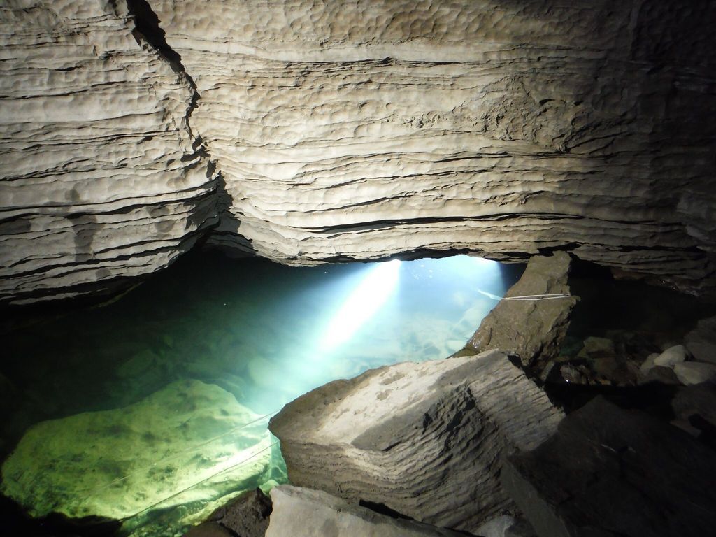 On my way back through I took my time, checking the walls for additional leads. In sump one I was able to find a couple, but one in particular caught my eye since the flow had changed direction nearby. I made a jump, and immediately came to a restriction. I was only 6′ deep, and looking up I could see going passage on the other side. I made my way through the restriction, and surfaced into a beautiful air chamber, unknown and unexplored. The dimensions were about 30′ long, by 8’+ tall. Leaving my spool and line in place, I returned to my main exploration line and continued my way out the sump.
