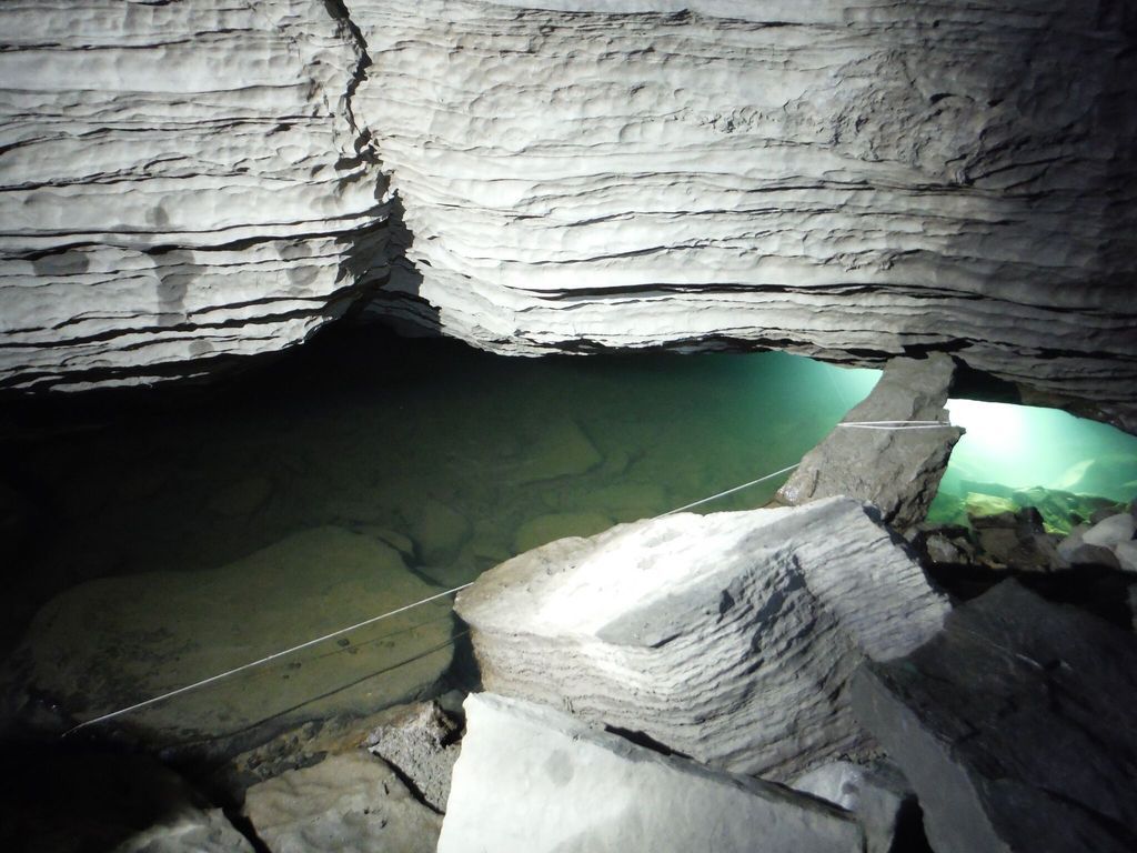 After completing my equipment checks and calculating my gas reserves, I entered the sump. Entry is a bit awkward, I had to kneel in a shallow stream to put my fins on, and then flop forwards towards deeper water as I ducked to miss the overhanging rock and enter the sump. The “refreshing” water began to enter my wetsuit, I grabbed my reel and began the dive.