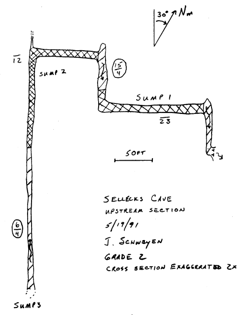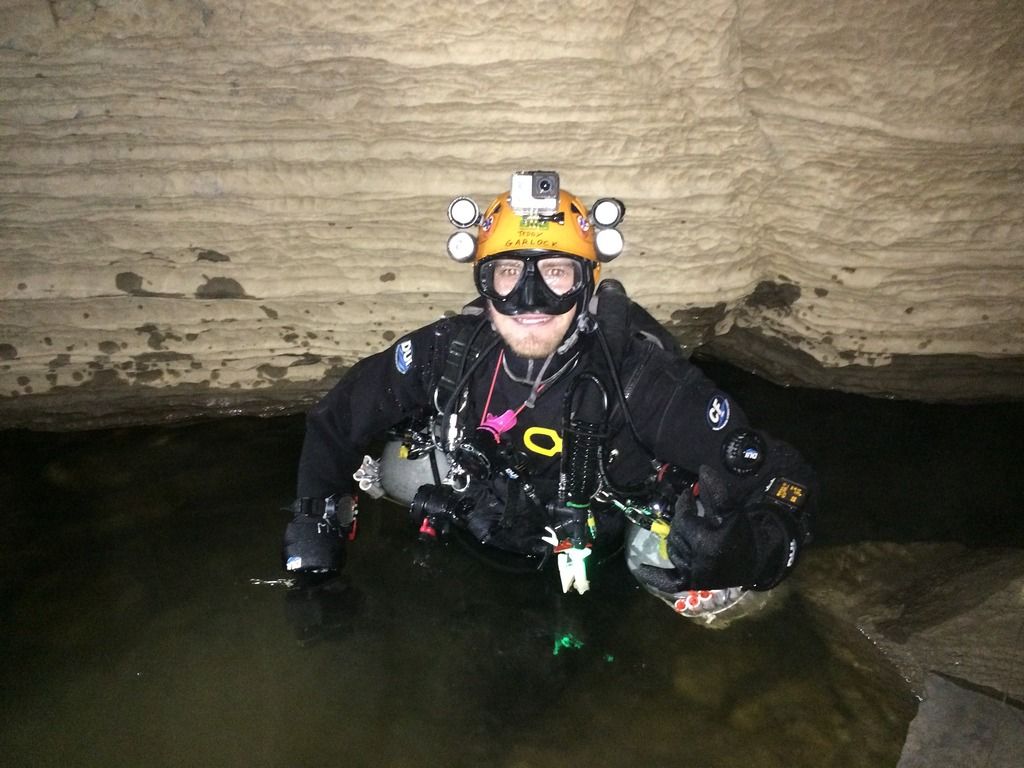 On June 28th, myself and a team of sherpas returned to Sellecks with some different gear in an effort to push past the 1991 exploration efforts of John Schweyen. During my first dive in Sellecks sump one I utilized a wetsuit and sidemounted 40’s, and reached the limit of comfort and safety at about the entrance of sump two. During my return I elected to use a drysuit, as well as sidemounted LP95 tanks, greatly increasing the volume of air and potential for exploration distance. In the end, efforts were successful and I was able to add 140′ of distance to the previously unexplored sump three. This trip was made possible by the help of sherpas Nathan, Joey, Mitch, Joe, Asif and Luke.